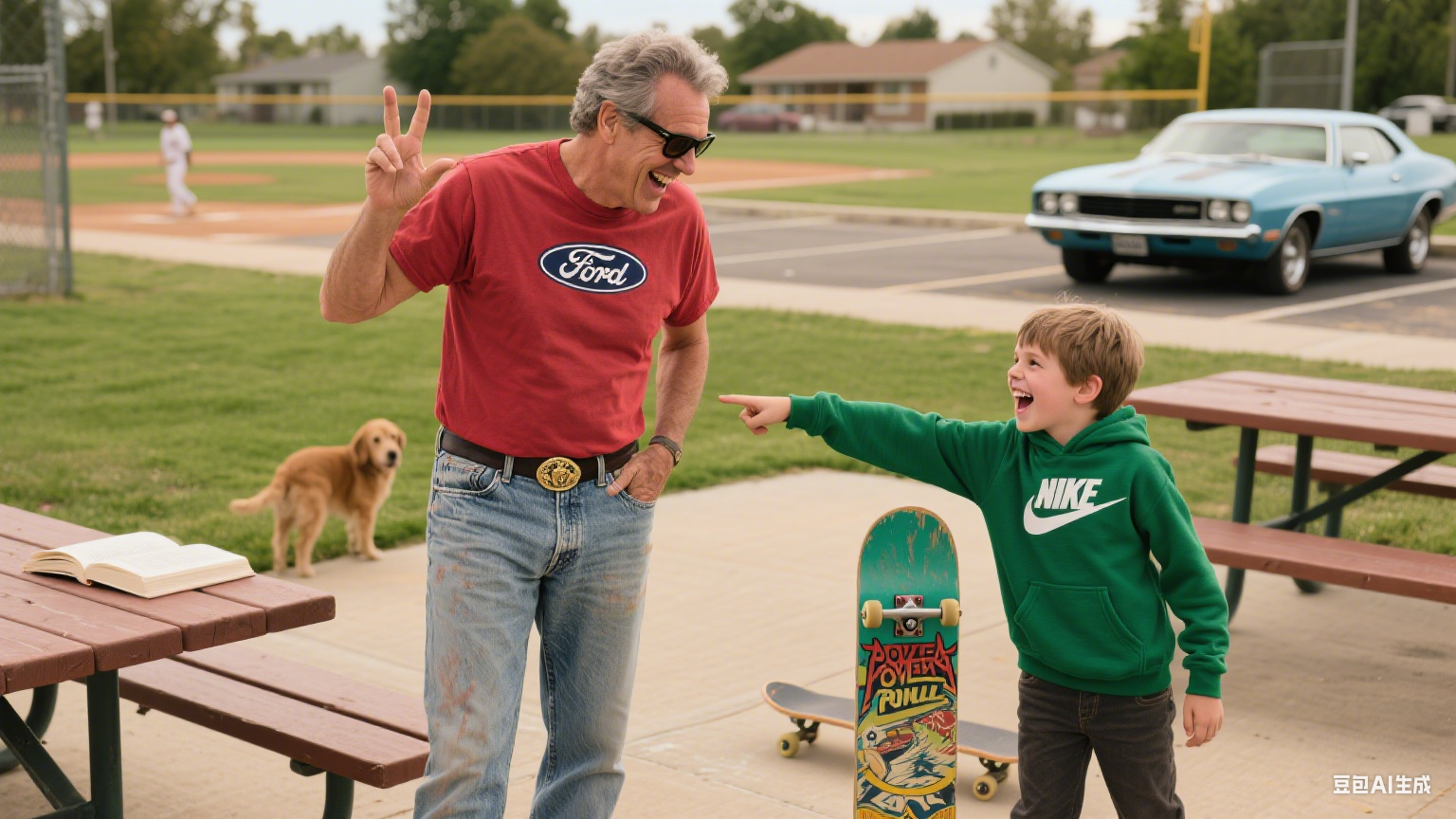 Out in the open park, where the scent of freshly cut grass fills the air and that vintage Ford in the background whispers tales of the past, we're reminded of the simple joys of life. The man in the Ford shirt, flashing a peace sign, and the young boy sharing a moment of laughter—this is what it's all about.